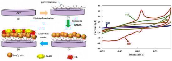 - Shoja, Y.; Rafati, A.A.; Ghodsi, J. Polythiophene supported MnO2 nanoparticles as nano-stabilizer for simultaneously electrostatically immobilization of d-amino acid oxidase and hemoglobin as efficient bio-nanocomposite in fabrication of dopamine bi-enzyme biosensor. Mater. Sci. Eng. C 2017, 76, 637–645. [Google Scholar] [CrossRef] [PubMed]