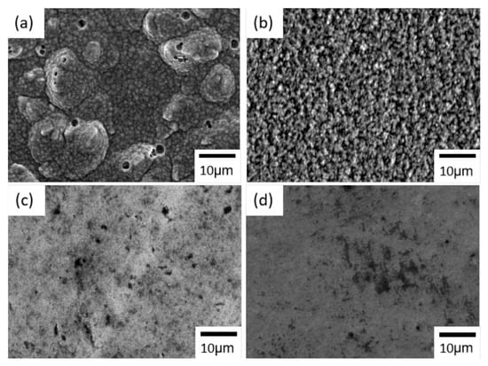 After introducing nickel bromide into the sulfamate bath, the alloy surface showed particle-like structures, and sizes of the particle-like structures were also on the micrometer-scale, as shown Figure 1b. The overall condition of the surface became more uniform when compared with the alloy electrodeposited without additives, and no obvious defect was observed. For the nickel–cobalt alloy produced with the bath containing the Surf-Bright, Figure 1c, the surface was also composed of particle-like structures but with Surf-Bright a much smaller size when compared with the alloy electrodeposited from the bath containing nickel bromide. When both nickel bromide and the Surf-Bright were used in the bath, the surface morphology was similar to that of the alloy obtained from the bath containing the Surf-Bright, as shown in Figure 1d.