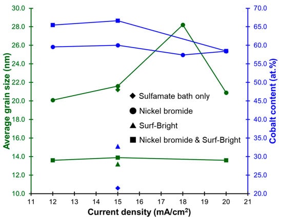 Effects of the current density on the average grain size, cobalt content, and micro-hardness.