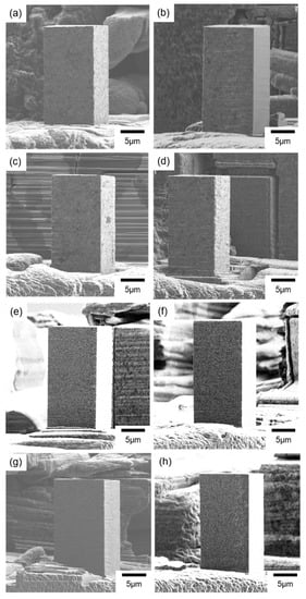 SIM images of micro-pillars fabricated from the alloys are shown in Figure 4. The micro-pillars were all precisely fabricated with a square cross-section, and the aspect ratio of height to length of one side was two. Boundaries of the crystal structure in metallic materials could be observed from the SIM images. On the surfaces of the micro-pillars prepared in this study, camouflage patterns were observed, and these were suggested to be the texture boundaries since the sizes of the patterns were all much larger than the average grain size values estimated from the Scherrer equation. For instance, the average grain size of the alloy electrodeposited at 15 mA/cm2 in the sulfamate bath containing the nickel bromide was 21.6 nm, and the average size of the camouflage patterns was in the hundreds of nanometers level.