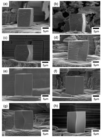 Micro-pillar type specimens were fabricated from the nickel–cobalt alloys by a focused ion beam system (FIB, FB2100, Hitachi, Tokyo, Japan) using Ga as the liquid metal ion source. A four-step milling method using different beam currents was applied to produce micro-pillars with desired and precise dimensions [1,2]. The beam currents were 6.64, 1.48 and 0.35 nA for coarse milling and 0.07 nA for fine milling and final polishing. The micro-pillar had a cuboidal shape with dimensions of 20 µm in height and a 10 × 10 µm2 square cross-section. Observations of the micro-pillars were conducted through a scanning ion microscope (SIM) installed in the FIB before and after the micro-compression test.