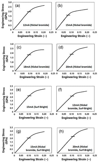 Engineering stress–strain curves generated from compression of the micro-pillars fabricated from the nickel–cobalt alloys electrodeposited with the bath containing (a–d) nickel bromide, (e) the Surf-Bright, or (f–h) both nickel bromide and the Surf-Bright, and at a current density of (a,f) 12 mA/cm2, (b,e,g) 15 mA/cm2, (c) 18 mA/cm2 and (d,h) 20 mA/cm2.
