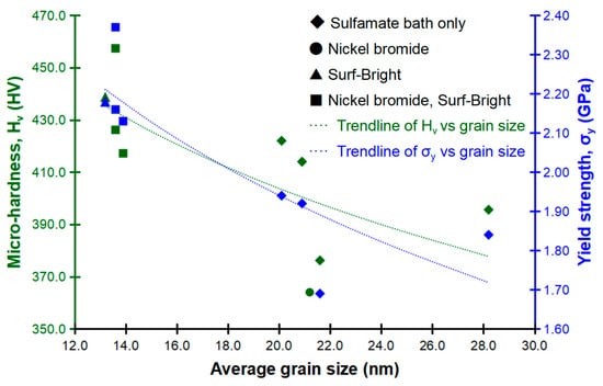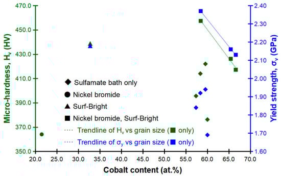 Relationships between the composition, micro-hardness and yield strength are shown in Figure 8. The composition dependency of the mechanical strength was not that obvious. A weak relationship between the composition and the strength could be concluded since a local maximum in the strength was obtained as the composition approached roughly 58 at.% of cobalt. For the three alloys electrodeposited with the two additives (nickel bromide and the Surf-Bright, ■), the average grain size merely changed between 13.6 and 13.9 nm and the cobalt content varied between 58.48 to 66.64 at.% when the current density changed from 12 to 20 mA/cm2. In these three alloys, a decrease in both of the micro-hardness and yield strength was observed following an increase in the cobalt content as indicated by the dashed trendlines in Figure 8.