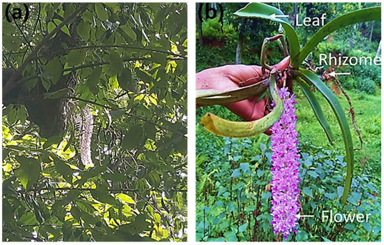 (a) Rhynchostylis retusa in the host tree, (b) Rhynchostylis retusa showing Rhizome, leaf, and flower.