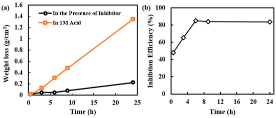 Weight loss of MS and inhibition efficiency of alkaloids extracted from RR at various time intervals are observed and represented in Figure 3a,b, respectively. Initially, the weight loss in acid and the presence of the inhibitor is slightly different; however, later on, the weight loss of MS samples in presence of an inhibitor is significantly decreased. This shows that initially the protective layer of the inhibitor is not completely formed, but later the formation of the protective layer is completed, hence weight loss is minimized. Due to a longer period of exposure to MS in acidic medium desorption can also happen, which results in slight weight loss even in presence of an inhibitor.