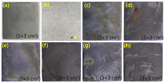 The digital images of MS surface (a,b) polished MS at different magnification, (c) after dipping in 1 M H2SO4 for 1 h, (d–h) after dipping in 200, 400, 600, 800, 1000 ppm green inhibitor respectively for 1 h at 25 °C.