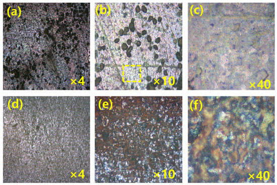 The MS surface images (a–c) after 1 h dipping, and (d–f) after 3 h dipping at 25 °C in the solution of 1000 ppm green inhibitor at different magnifications.