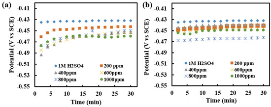 (a) Recorded OCP with a time of immersion of MS in different concentrations of inhibitor of 1 M H2SO4 in as-immersed condition, and (b) Recorded OCP with the time of immersion of MS in different concentrations of inhibitor of 1 M H2SO4, when measured after 3 h of immersion.