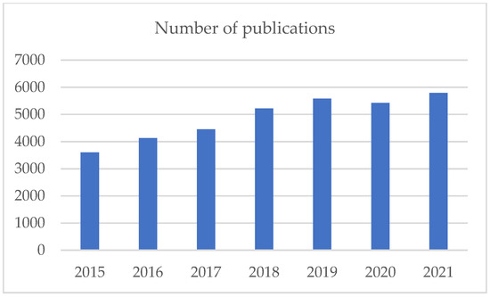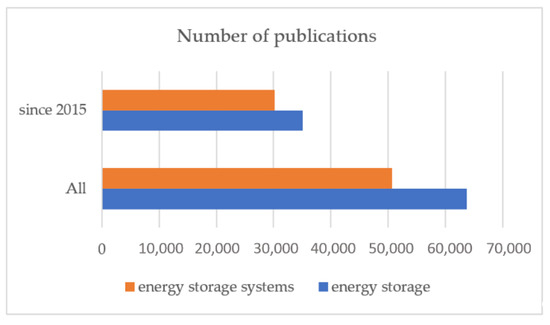 Electrochemical energy storage systems have become a hot topic worldwide. The “energy storage” and “energy storage systems” were used as the search term in IEEE Xplore, and the number of publications (including Conferences, Journals, Early Access Articles, Magazines, Books, and Standards) in this discipline has increased steadily within the last few years. As shown in Figure 1, the number of publications with both “energy storage” and “energy storage systems” accounts for more than 50% of their respective totals since 2015. As shown in Figure 2, since 2018, the number of publications has remained at more than 5000 per year, with a maximum of 5793 in 2021, and is expected to reach more than 5000 in 2022, considering that there are 940 publications already so far in 2022 (Data acquisition time ends on 13 April 2022).