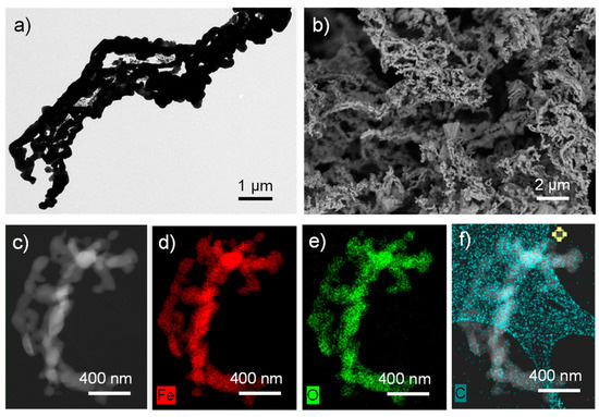 Electrospinning is an effective technique for the fabrication of fine fibres of several materials, including polymeric composites, as well as inorganic materials [32]. In our case, the process starts by pumping a PAN/PMMA/C4H14FeO8 solution in DMF, while creating an electric field via imposing a voltage between the collecting plate and the spinning nozzle. Since the electrostatic repulsion of the charges accumulated at the surface of the solution overcome the surface tension of the liquid, the liquid meniscus is transformed into a Taylor cone, and a charged liquid jet is ejected towards the collecting plate [32]. Since the solvent evaporates from the whipping motion occurring during its flying time from the Taylor cone to the collecting plates, solid fibres are formed and finally deposited on the collecting plate in form of a non-woven mat [32]. To produce our active materials, the so-produced fibres are then annealed following a two-step protocol. First, a pre-oxidation step at 230 °C for 1.5 h in open air is carried out to stabilize PAN into the thermally stable ladder-like polymeric structure by means of dehydrogenation and intracyclization reactions [33,34]. Meanwhile, PMMA progressively decomposes into gaseous products via depolymerization, random scission, and side/terminal-group elimination [35,36,37]. The volatile gaseous products leak out the electrospun fibres forming microporous structures [38]. Secondly, the pre-oxidized fibres are calcined/carbonized at 600 °C for 2.5 h in an O2/Ar (15:85 vol/vol) atmosphere. Previous studies in the literature have indicated that an insufficient supply of oxygen can effectively remove hydrogen from organic matter, leading to chars and/or black carbon that reduce reactivity to oxygen [39]. Thus, the pre-oxidized PAN is partially carbonized, while metal precursors evolve into metal oxide colloids (PMMA is, instead, completely decomposed, promoting pore formation) [35,36,37]. As shown by BF-TEM imaging (Figure 1a), the synthesized powder consists of elongated nanoparticles with a sub-µm size and linearly connected into a worm-like morphology, forming porous fibre tangles. Figure 1b reports the SEM image of the as-synthesized powder, confirming the morphology observed in the TEM images. The STEM-EDS characterization (Figure 1c–f) revealed the presence of Fe, O, and C, with a C/Fe atomic ratio (measured on a region of the material suspended on vacuum) of 0.13. We notice that other regions displayed even lower C content (data not shown). Meanwhile, the Fe/O atomic ratio was found to be ca. 1. Figure S1 reports the SEM-EDS analysis of a C-Fe2O3 film, revealing the main presence of Fe and O in the sample.