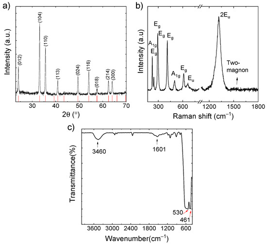 (a) XRD pattern; (b) Raman and (c) FT-IR spectra of the as-synthesized C-Fe2O3 active material. In panel (a), the reference XRD pattern of α-Fe2O3 (ICSD structure-22505) is also shown in red bars.