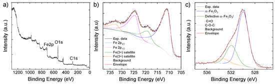 Even though Raman and FT-IR analyses did not clearly detect carbonaceous materials, the wide scan XPS spectrum (Figure 3a) indicates the presence of 51.4 atomic percentage (at%) of C in the as-synthesized active material. Because of the surface sensitivity of the XPS technique, our data indicate that C is mainly located on the surface of the C-Fe2O3. The at% of Fe (11.76) and O (52.4) is consistent with the presence of α-Fe2O3 together with oxidized organic matter. The deconvolution of the Fe 2p XPS spectrum (Figure 3b) evidences the band centered at 710.8 eV for Fe 2p3/2 and 724.3 eV for Fe 2p1/2, corresponding to spin orbit splitting of 13.5 eV, as expected for α-Fe2O3 [47,54]. In addition, the bands located at 719.0 eV and 732.6 eV are those of the satellite peaks associated with Fe 2p3/2 and Fe 2p1/2, respectively [47,54]. The deconvolution of the O 1s XPS spectrum (Figure 3c) reveals the main band with a peak at 530.0 eV associated with the lattice oxygen of α-Fe2O3 [55]. The bands at higher energy with peaks at 531.9 eV can correspond to either oxygen defects in the metal oxide matrix [22] or surface oxygen containing groups (C=O) [41], while the peak at 533.3 eV is associated with oxygen in the C-O-C bonds [41]. To better estimate the overall content of C in the C-Fe2O3 sample, TGA curves were acquired in air to estimate the α-Fe2O3/C mass ratio. As shown in Figure S3, the weight loss at temperatures below 100 °C is associated with the loss of absorption water in the composite. Beyond 100 °C, the thermal decomposition of some residual oxygen-containing functional groups on C appear, followed by the decomposition of the of the carbonaceous species. Thus, these data revealed that the C content is 10.2 wt%, which is consistent with the previous material characterizations (e.g., STEM-EDS) as well as with the Fe content detected by ICP-OES (61.4 wt%).