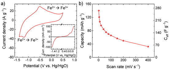 (a) CV curve of the C-Fe2O3-based electrode in 6 M KOH (potential scan rate = 100 mV s−1). The inset shows the LSV analysis of the electrode, indicating the onset potential of irreversible water splitting reaction (potential scan rate = 2 mV s−1); (b) capacity and Ceff of the C-Fe2O3-based electrode as a function of the potential scan rate.