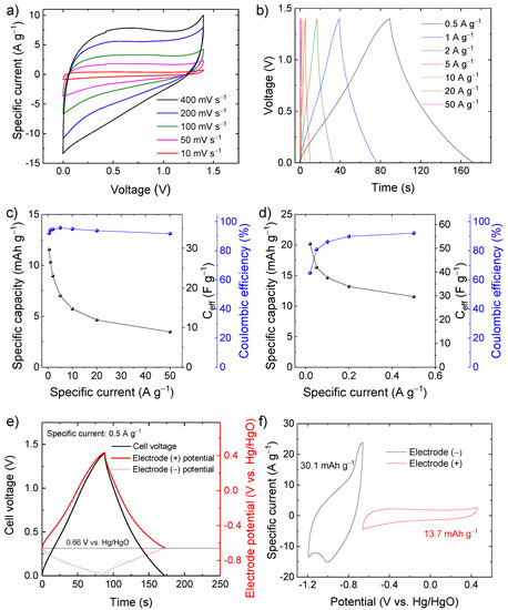 Based on these preliminary results showing high-capacity performance in a wide potential window, the C-Fe2O3 electrodes were used to assemble symmetric SCs. The CV and galvanostatic CD measurements (Figure 5a,b) indicate that the symmetric SCs can operate in a voltage window of 1.4 V with CE higher than 90%, reaching a specific capacity of 11.5 mAh g−1 (Ceff = 29.7 F g−1) at a specific current of 0.5 A g−1 (Figure 5c). At a specific current lower than 0.5 A g−1 (Figure 5d), the symmetric device can reach even a specific capacity of 20.2 mAh g−1 (Ceff = 51.8 F g−1) at 0.02 A g−1, but the CE progressively decay to values lower than 90%. To rationalize the limit of this symmetric SC, the potentials of the positive and negative electrodes were monitored through an auxiliary reference electrode during SC charging and discharging (Figure 5e) at the specific current of 0.5 A g−1. The potential of zero voltage (PZV) of the electrode, i.e., the equipotential of the electrodes when the SC is fully discharged [73], is ca. 0.66 V vs. Hg/HgO. When the SC is charged up to 1.4 V, the positive electrode reaches a maximum potential approaching 0.4 V vs. Hg/HgO, at which oxygen evolution reaction takes place (see Figure 4a), thus, limiting the maximum charging voltage of the cell (see Figure 5a,b). In contrast, the negative electrode reaches a minimum potential of only −0.97 V vs. Hg/HgO, which is well above the potential where irreversible hydrogen evolution reaction occurs (see Figure 4a). These data indicate that the capacities of electrodes are not properly balanced, as further confirmed by CV analysis of the single electrodes (Figure 5f).