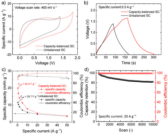 To solve the limitations of the symmetric SC, the capacities of the electrodes were balanced by adjusting the mass loading of the active material according to Equation (7), assuming the specific capacity calculated from the CV curves of the electrodes of the symmetric SC, i.e., 30.1 mAh g−1 for the negative electrode and 13.7 mAh g−1 for the positive electrode (see Figure 5f). Since the electrodes are made of the same chemical composition, the resulting SC is hereafter referred as quasi-symmetric SCs. Figure 6a,b show the comparison between the CV and galvanostatic curves (measured at 400 mV s−1 and 0.5 A g−1, respectively) measured for our capacity-balanced quasi-symmetric SC and the unbalanced device. By balancing the electrode capacities, the voltage window of the SC is extended as compared with the unbalanced devices, significantly improving the specific capacities for the investigated specific currents (Figure 6c), while preserving CE higher than 80%. For example, at 0.5 A g−1, the capacity-balanced SC reached a specific capacity of 20.0 mAh g−1 (Ceff = 43.5 F g−1 and energy density = 9.1 Wh kg−1), while the unbalanced device only exhibited a specific capacity of 11.5 mAh g−1 (Ceff = 29.7 F g−1 and energy density = 4.0 Wh kg−1). Noteworthy, the energy density reached by our capacity-balanced quasi-symmetric SC based on only C-Fe2O3 electrodes is competitive with those of asymmetric SCs recently reported in the relevant literature [74,75,76]. In addition, the stability of the capacity-balanced SC was evaluated over 10,000 galvanostatic CD cycles at 20 A g−1. After 1000 cycles, the device retained more than 90% of the initial capacity. The capacity of the device progressively stabilized over cycling and was still more than 80% at the end of the 10,000 cycles, proving satisfactory electrochemical stability of our C-Fe2O3-based capacity-balanced SC.