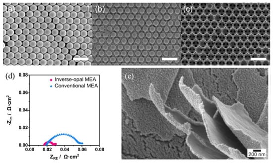As another case of employing the electrodeposition technique, Park et al. adopted the decal-transfer method to obtain an inverse-opal (IO) structured MEA, which features a hierarchically ordered and interconnected porous structure with monodispersed sized pores as shown in Figure 2a–c [51]. The researchers first employed a sacrificial polymer soft template on a smooth surface substrate and conducted electrodeposition of Ir to achieve the inverse-opal structure. The unique structure enhanced the mass transport of reactants. In addition, the porous structure considerably increased the specific surface area, which could improve the degree of catalyst utilization and cell efficiency. Through the simple and reproducible synthetic process, the resultant IO-IrO2-MEA not only showed lower ohmic resistance when compared to the conventionally prepared MEA but also showed remarkable improvement in PEMWE performance with 870 mA·cm−2 at 1.6 V with a low loading of 0.02 mg·cm−2; the performance was 2.5-fold higher when compared to the conventional MEA. Figure 2d shows the Nyquist plot at 1.6 V of IO MEA and the conventional MEA. The first x-intercept shows the ohmic resistance and the diameter of the circle shows the charge transfer resistance is both lower on IO-ME compared to the conventional MEA. These results mean that IO-MEA enhances the electron transfer and charge transfer due to its ordered structure.
