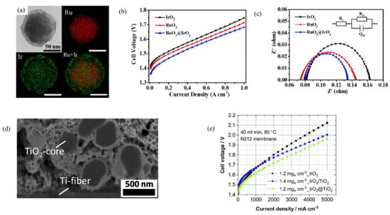 (a) TEM image of core shell RuO2@IrOx nanoparticles and their corresponding EDX mapping, which shows the presence of Ru and Ir. (b) Polarization curves of the membrane electrode assemblies (MEAs) using RuO2, IrO2, and RuO2@IrOx as the OER catalyst. (c) Nyquist plots of the MEAs fabricated by using different catalysts, data were taken in the single cell at 0.1 A·cm−2 and 80 °C; the inset shows the equivalent circuit model. Reproduced with permission [79]. Copyright 2020, Elsevier Inc. (d) FIB/SEM cross-sections of the IrO2@TiO2 catalyst layers, the catalyst was deposited on titanium porous transport layers (PTL) containing 5 wt. % Nafion. (e) Polarization curves of the PEM water electrolysis cells using IrO2@TiO2 catalysts and commercially available unsupported IrO2 (Alfa Aesar) and IrO2/TiO2 (Umicore). Reproduced with permission [80]. Copyright 2020, Elsevier Inc.