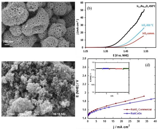 (a) SEM of Ir0.7Ru0.3Ox catalyst calcined at 450 °C. (b) Cyclic voltammetry (forward scan) was recorded at 6 mV·s−1 of the Ir0.7Ru0.3O2 and IrOx samples obtained after calcination in air at 450 °C and commercial IrO2 with total catalyst loading of 0.0176 mg. Reproduced with permission [81]. Copyright 2018, John Wiley and Sons. (c) SEM of RuIrCoOx OER catalyst. (d) Polarization curves on a single cell (electrodes area of 4 cm2) with RuIrCoOx and RuIrOx catalysts, the inset shows electrolyzer voltage vs. time measured during the initial 15 h of operation at 25 °C. Reproduced with permission [83]. Copyright 2013, Elsevier Inc.
