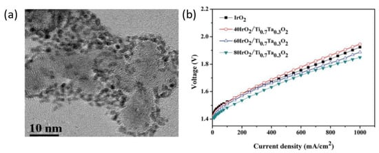 Compared to the layered IrO2/TiO2 structure, the core shell structure is preferred to achieve the high activity with the least amount of catalyst loading. In another work, a mixed-phase TiO2 doped with Ta was used as a support for IrO2 for PEM water electrolysis; Figure 5a shows the TEM of the 40IrO2/Ti0.7Ta0.3O2 catalyst. The catalyst with the composition of 40IrO2/Ti0.7Ta0.3O2 gives the highest activity in PEM water electrolysis, at a current density of 1000 mA·cm−2, the cell voltage was 1.849 V for 40IrO2/Ti0.7Ta0.3O2 catalyst; the polarization curves are shown in Figure 5b. The improved performance was attributed due to the lower ohmic resistance and charge transfer resistance [94]. The enhanced performance was attributed to the higher electrochemical surface area; the total metal content was also reported to be half [95]. The IrO2/Ti catalyst was developed by Miller et al. by physically mixing the IrO2 catalyst and Ti metal support. The physical mixing process increased the dispersion of IrO2 over Ti particles and when it was used as an anode in the electrolyzer operation, a high activity was achieved. The cell voltage was 1.73 V at 1 A·cm−2 with the catalyst loading of 0.12 mg·cm−2 [87]. When same catalyst was modified with Mo, it resulted in a higher surface area and small particle size. Small-particle-sized IrO2 (2–3 nm) was also synthesized by using the sulfite complex route [96,97].