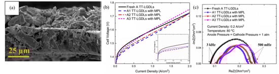 Rather than using MPL to modify GDL, porous GDL were reported to be fabricated by sintering Ti particles to achieve the desired porosity and structure. Grigoiev et al. fabricated and optimized the titanium current collector by sintering Ti particles with varying size. From their optimization study, they concluded that the optimum particle sizes were 50–75 μm and the pore size was 12–13 μm [115]. A hierarchically structured porous transport layer (PTL) with specifically designed interfaces was fabricated for the PEM electrolyzer. It was named the multi-layer porous transport layer (ML-PTL). Four sintered Ti PTL were fabricated in which three different microporous layers were used with particle sizes of 7, 15 and 18 μm on a relatively coarser support layer of 33 μm. ML-PTL were made by co-sintering Ti powders; the PTL had high porosities of 35%, a low tortuosity of 1.7, and a high thermal conductivity of 10 W·(mK)−1. In addition, ML-PTL has a very low surface roughness of 11 to 16 μm whereas the support layer has a roughness of 28 μm [116]. As there was a discrepancy in the results when Ti MPL was used to modify GDL, an alternative method was used to study the effect of MPL with different particle sizes of Ti. The MPL was developed on thin tunable liquid gas diffusion layer by depositing titanium micro particles 5 μm and nano 30–50 nm particles. Figure 6a shows the cross section of the gas diffusion layer deposited with 5 μm particles of Ti with a coating thickness of 20 µm. Figure 6b shows the performance of the PEM electrolysis cell, due to the application of MPL there was a slight enhancement in the activity at a low current density range of less than 0.5 A·cm−2 where the cell voltage was lower for the modified GDL with MPL. In that current density range, the activation overpotential was the main contributor to the total cell voltage, and the increase in the thickness of the MPL caused the cell voltage to increase. Figure 6c shows the Nyquist plot with different frequency ranges, the x-intercept at high frequency (>3 kHz) is indicative of the ohmic resistance, which increased with the increase in the MPL thickness. In contrast, activation resistance, which is indicated by the diameter of the semicircle, decreased with the addition of MPL over GDL. The micro particles MPL caused an increase in ohmic resistance but improved the catalytic activity, whereas nano particle MPL did not change the catalytic activity but increased the ohmic resistance greater than the former one. The micro particle MPL provided a higher surface area which increased the active sites and thus the catalytic activity. The nano MPL formed a dense surface and decreased the possibility of increasing the OER active sites [111].