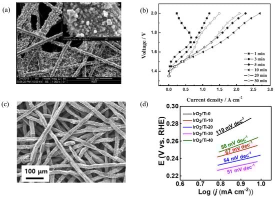 Electrodeposition of IrO2 was also studied on titanium felt electrode; prior to deposition the surface roughness and the native oxide was controlled by etching in 5% oxalic acid. Titanium felt which was etched at 30 min and further coated with IrO2 showed higher surface area and uniform thickness of the IrO2-deposited coating, Figure 8c shows the SEM of electrodeposited catalysts with an etching time of 30 min. The deposited electrode did not show any cracks as it was reported in other studies. Over-etching of the titanium felt for greater than 40 min caused the agglomeration of deposited particles. The OER test was performed in 0.1 M HClO4 with a three-electrode system, the overpotential and the Tafel slope for the IrO2/Titanium felt (etched for 30 min) was 370 mV and 51 mV·dec−1, which are the lowest values compared to other samples etched from 0 to 40 min; Figure 8d shows the Tafel plots for the OER reaction with different catalyst-coated titanium felt as a function of etching time. They reported the mass activity of 362.3 A·g−1 of Ir at 2 V (vs. RHE), with a loading of 0.2 mg·cm−2 [125].