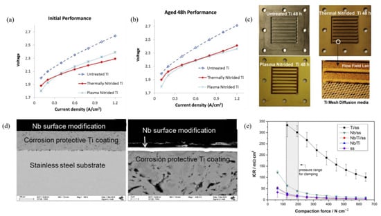 Titanium separator plates are commonly used on the anode side and to prevent them from oxidation and corrosion they are usually coated with Pt. Research into substituting the noble metal coating and replacing them with refractory coatings is in progress. Plasma and thermal Nitridation approaches were also considered to modify the Ti (BPs) because they provide pinhole-free coatings. A TiN-based coating was applied to Ti BPs using thermal and plasma methods. Figure 9a shows the polarization curves using untreated, thermal, and nitride BPs; there was a decrease in the cell voltage of 0.2 to 0.3 V for nitrided BPs compared to untreated plates at 1.2 A·cm−2. The cell performance was reported to increase due to the decrease in interfacial contact resistance. There was an increase in cell voltage after 48 h at 1.2 A·cm−2 while the voltage did not change for the plasma nitride plate (see Figure 9b). Figure 9c shows the untreated, thermal nitride and plasma nitride plates after 48 h of cell operation and the magnified image of the thermal nitride plate flow field. The PEM water electrolysis performance for nitride Ti was 3–13% higher compared with untreated Ti (BPs). Oxidation of the TiN coating was reported for a longer operation of 500 h, with TiO2 deposits on the TiN coating. It was also reported that nitriding decreased the uptake of H2 and would decrease the susceptibility of Ti embrittlement due to TiH formation [141].