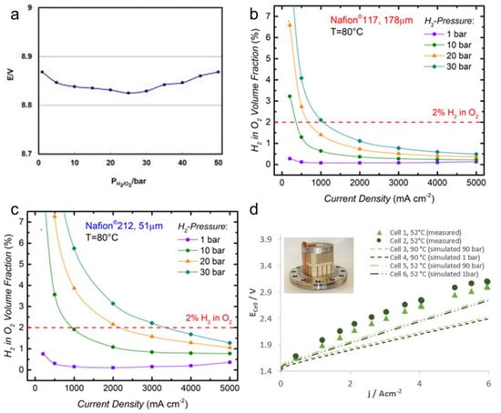 - Bernt, M.; Schröter, J.; Möckl, M.; Gasteiger, H. Analysis of gas permeation phenomena in a PEM water electrolyzer operated at high pressure and high current density. J. Electrochem. Soc. 2020, 167, 124502. [Google Scholar] [CrossRef]