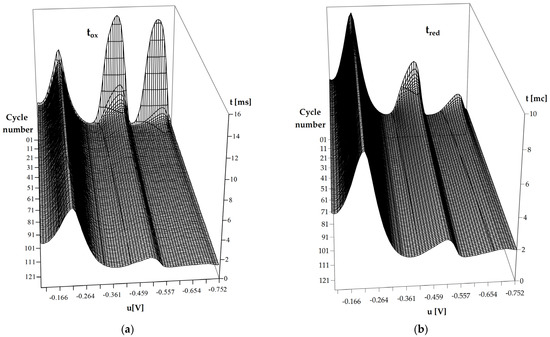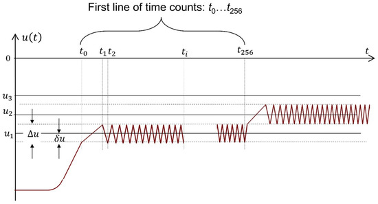 22]. The potential scale was divided into several adjacent intervals. For each interval, its own current value was set. The analytical signal of the device is a sequence of time intervals that fix the time moments of the system passing through the given points in the coordinates u-i. Thus, a continuous cyclic operation of the cell was ensured. All intervals are recorded in real-time. The amplitude of the control current for each of the eight intervals is set separately. The analytical signal is a sequence of Faraday charges, and each charge is bound to a given interval potential and real-time (
