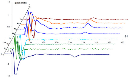 Supplementary Materials). The video shows eight chromatograms in polar coordinates. The signals are normalized so that the electrochemical image of the eluent is approximated to coincide with a regular octahedron. The initial fragment of the chromatogram from 26 to 130 s is slowed down by a factor of 4. This time interval corresponds to the passage through the detector of an unseparated sample.