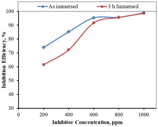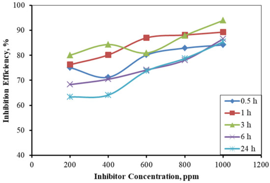 The inhibition efficiency of the inhibitor molecules of different concentrations in the 1 M H2SO4 for the MS samples is shown in Figure 5. The inhibition efficiency increased with up to 3 h immersion time, and decreased with up to 6 h immersion time, and remained constant with up to 24 h. The inhibition efficiency of the 1000 ppm inhibitor solution was found to be the highest. The maximum inhibition efficiency was found to be 93.96% of 1000 ppm solution at a 3 h immersion time and 85.40% even for a 24 h immersion time, and similar trends were observed for all the concentrations of the inhibitors. The general hypothesis is that after formation of a protective layer of the inhibitor on the MS surface, the inhibition efficiency remains constant, even for long immersion times; however, the findings are do not accord with this. The orientation of the molecules on an adsorbed layer may lead to the formation of vacant sites that could allow the acid molecule to pass and interact with the MS.