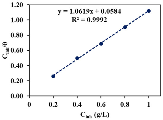 If the slope of the curve obtained by plotting versus Cinh in the above equation is unity, then it indicates the monolayer adsorption. As in the equation, if one uses the molar concentration of the inhibitor, then the value of the adsorption constant Kads can be calculated from the intercept of a straight line.