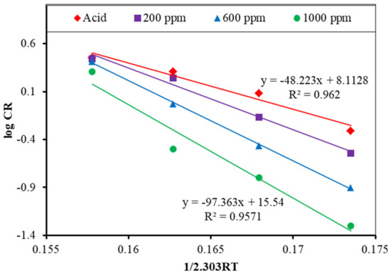 where A is the Arrhenius pre-exponential factor and T is the absolute temperature. Equation (7) shows that the activation energy of the reaction is equal to the slope of the Arrhenius plot, i.e., a plot obtained between the logarithms of the corrosion rate with along the axes.
