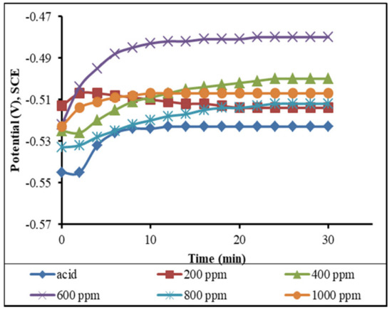 By observing the variations in the corrosion potential over time, the fluctuation of the mild steel’s open circuit potential (OCP) in the 1 M H2SO4 was investigated. The OCP modifications of the MS were exposed to acid solutions and inhibitors at various concentrations (200, 400, 600, 800, and 1000 ppm) for 30 min at 18 °C.