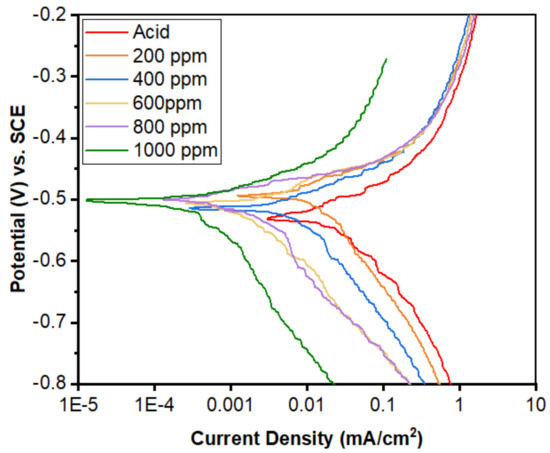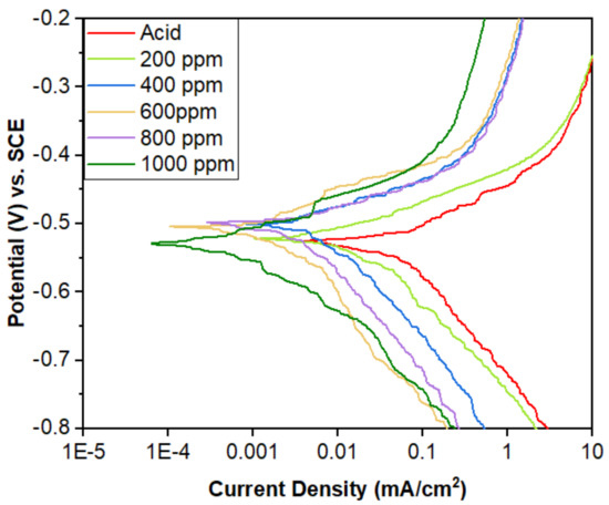 The polarization of the mild steel samples in the acid and various inhibitor concentrations (200, 400, 600, 800, and 1000 ppm) was accomplished by applying 350 mV in both anodic and cathodic directions using a potentiostat. The Evans diagram and Tafel extrapolation (Figure 16) show that the reduction in current density with the addition of an inhibitor signifies that the MS surface was covered with inhibitor molecules, resulting in a tiny active site for the process.
