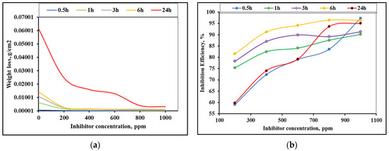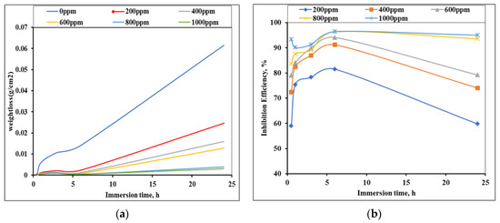 The results showed that the weight loss (expressed in gram per unit area) of MS dipped in the solutions of 1 M H2SO4 in the presence of the inhibitor was lower compared to that dipped in 1 M H2SO4 solution for different time intervals (i.e., 0.5, 1, 3, 6, and 24 h). From Figure 4a, it was observed that the weight loss of MS for half an hour of immersion time is very small in all different inhibitor concentrations. However, the corresponding inhibition efficiency was not so high, possibly due to incomplete surface coverage of MS by inhibitor molecules. In all cases, the weight loss increases with increasing immersion time, while the inhibitor’s effectiveness increases and then begins to decline after six hours. This is probably due to the subsequent desorption process. During adsorption, an inhibitor is assumed to produce a thin protective layer or barrier against corrosive molecules, while a desorption process is manifested due to the large size and orientation of the inhibitor molecule. Here, with an increase in time, the availability of the inhibitor molecules decreased due to the formation of a metal inhibitor chelate complex, which consequently led to a decrease in IE [6,21].