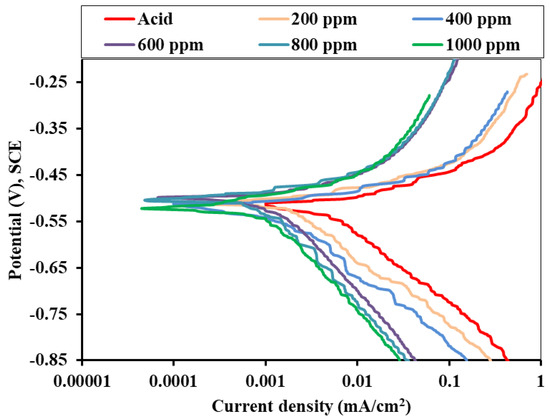 Potentiodynamic polarization curves for mild steel in 1 M H2SO4 containing different concentrations of the inhibitor as-immersed condition.