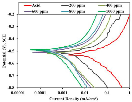 Similar measurements were carried out after immersion of the MS coupons in different solutions at 3 h, as shown in Figure 8. The current density was found to be decreased from a corrosive media to increasing inhibitor concentrations which may be due to increased corrosive resistance of MS in inhibitor media. Similar to the as-immersed condition, the lowering of current density is due to similar reasons. This consequence of the reaction in the small surface area of MS produces a small current density. This implies that the alkaloid used in this experiment functioned as a good inhibitor.