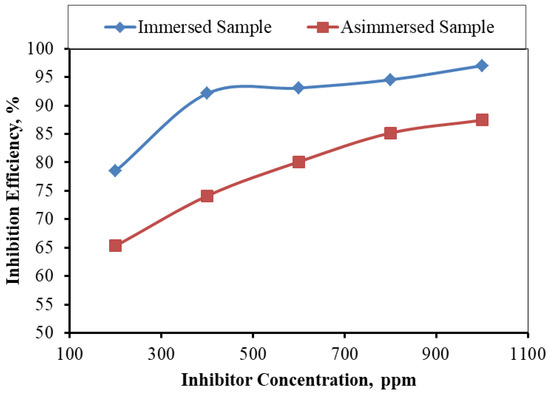 The inhibition efficiency of the inhibitor obtained from the polarization of both immersed and as-immersed MS samples in different concentrations of inhibitor.