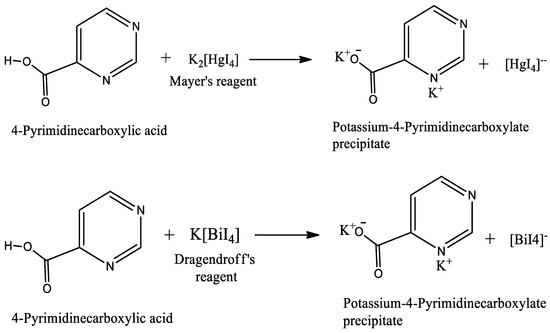 There were large numbers of alkaloid molecules in the mixture. These alkaloids can form a complex with the reagents, thus forming a colored precipitate. For simplicity, the reactions involved in the phytochemical screening of alkaloids are represented in the reference of 4-Pyrimidinecarboxylic acid as in Scheme 2 [5,29]: