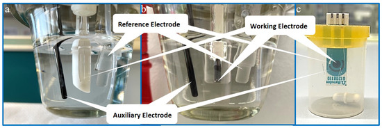 Photographs of the used voltammetric measurement cells: (a) HMDE setup, (b) solid state eletrode setup for BiFE measurement, (c) measuring cell with screen-printed electrode for BiSPE measurement.