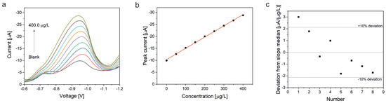 (a) Recorded HMDE voltammograms of different platinum standard solutions. (b) Resulting calibration curve with linear regression (red line) (after subtraction of blank values). (c) Results of the point-to-point gradient linearity test of the linear calibration curve.