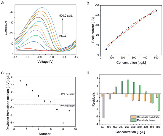 To determine the working range and the LOD and LOQ values of the BiSPE, a calibration line was first recorded. For this purpose, 10 calibration points in the range of 50.0–500.0 μg/L were measured. Concentrations above 500 μg/L could not be analyzed because a saturation effect was detected there. At concentrations below 50 μg/L, no signal associated with platinum could be identified. The resulting voltammograms are shown in Figure 5a and the corresponding calibration diagram is depicted in Figure 5b. The visual consideration of the calibration points and the rather low coefficient of determination of 0.981 suggests that there is no linearity. To check this assumption, a linearity test was performed. For this purpose, the deviations from the slope median were calculated and plotted in a diagram (Figure 5c). A trend can be clearly seen in the linearity test with significant deviations from the 10% threshold at both low and high concentrations. Therefore, the concentration range of 50–500 μg/L is to be considered as non-linear. For this reason, a regression with a 2nd order polynomial calibration function was run (Figure 5b). It can be seen visually and from the coefficient of determination ( = 0.9993) that a 2nd order regression shows a much better correlation than the linear calibration. To further illustrate this, the residuals were also calculated and plotted for both regression functions (Figure 5d). When comparing the residuals of the 1st and 2nd order polynomial, it can be clearly seen that the residuals are significantly smaller for the 2nd order calibration function.