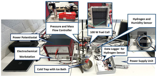 Two different load profiles were applied to a 100 W PEM fuel cell stack to obtain product water as realistic test sample for the voltammetric ultratrace determination of platinum. An image of the fuel cell test setup is depicted in Figure 6.
