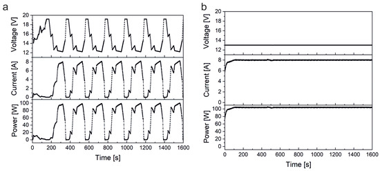The different load profiles were applied to reflect different stress scenarios: continuous high power at about 100 W and dynamically alternating power between minimum and maximum power. The dynamic cycle was adapted from the worldwide harmonized light duty test procedure (WLTP). This protocol was developed by the United Nations Economic Commission for Europe (UNECE) and serves the purpose of determining the pollutant emissions of passenger cars and light commercial vehicles [36]. Depending on the performance of the vehicle, a distinction is made between three different classes. Passenger cars are classified in class 3. This test cycle is divided into four parts according to maximum speed: low, medium, high, and extra high speed. In order to produce as much product water as possible, only the most power-intensive sections “high” and “extra high” were used for the dynamic stress test in this work. The resulting potential, current, and power curves are depicted in Figure 7a. The profile shown corresponds to one loop, which is repeated a total of 14 times. This results in a total cycle time of approximately 6 hours. For operation at continuous high load, a voltage of 13 V was applied for approximately 6 hours. This corresponds to a current of approximately 8 A and a power of approximately 105 W (Figure 7b).