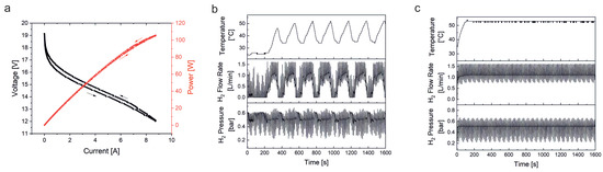 During load cycling, more parameters such as the applied hydrogen pressure and flow rate as well as the measured stack temperature were logged. In addition, polarization curves were recorded before and after the stress tests. A representative set of data is shown in Figure 8.