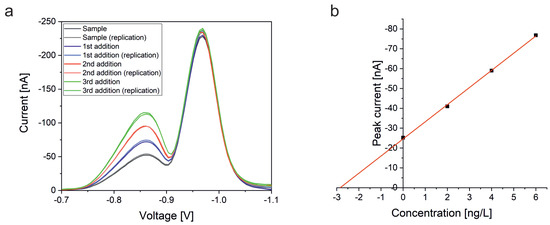 For the accumulation mode, a potential of −1.0 V was applied for 300 s. During coating, the solution was stirred at 200 rpm. After a rest time of 5 s, a voltammogram was recorded in the range of −0.6 and −1.1 V with a sweep rate of 0.04 V/s, a pulse amplitude of 0.05 V, and a pulse time of 0.04 s. After coating, the electrode was carefully rinsed with Milli-Q water.