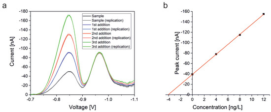 First of all, the HMDE was validated for the determination of platinum in aqueous samples. An image of the HMDE measuring cell is depicted in Figure 2a. To identify the working range, voltammograms were recorded in the concentration range between 5.0 and 40.0 ng/L platinum (Figure 3a). The resulting averaged peak currents were then plotted against the respective platinum concentration in order to obtain the calibration curve (Figure 3b). For the linear regression a determination coefficient of 0.9997 was calculated. In order to prove the linearity, the point-to-point gradient was determined and compared with its median. As can be seen in Figure 3c, only little (<10%) and no systematic deviation from the median is observed. Accordingly, the platinum measurement in the range of 5.0–40.0 ng/L is to be assumed as linear and this range can be defined as working range. We also checked the working range of 50.0–400.0 ng/L platinum. However, the point-to-point deviation resulted in a large (>10%) and systematic deviation from the median above concentrations of 250 ng/L. This shows that the meaningful use of the method should be limited to lower concentrations.
