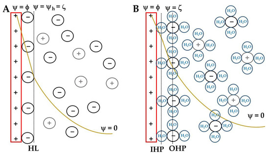 (A) Stern’s electric double layer model. Being the positively charged electrode in a red rectangle, the potential drop as a function of the distance from the electrode is a golden line. The initial anion layer is marked with a dotted black line, the Helmholtz layer. Anions are represented by black circumferences and cations as gray ones. (B) Grahame’s adaptation of Stern’s model is for the electric double layer. The solvent molecules were added (blue circumferences), and the HL was divided into two regions, the inner Helmholtz plane (IHP) and the outer one (OHP). The Helmholtz potential (), or ζ-potential, is also shown at the end of the HL in A and OHP in B.