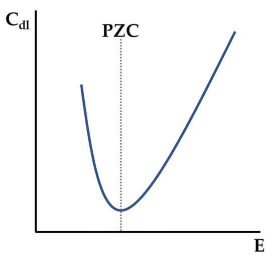 Representation of the double layer capacitance () variation with potential (E). The minimum is marked with a gray dotted line, representing the potential of zero charge (PZC).