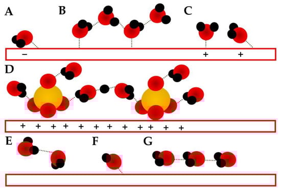 Schematics of water adsorbed structures on electrode surfaces (red rectangles). Red spheres represent oxygen atoms, black hydrogen, and yellow sulfur: (A) H-down conformation observed at potentials more negative than the PZC [7,8,9]; (B) “ice-like” bilayer structure observed around PZC [7,8,9,10]. (C) H-up conformation observed at potentials more positive than the PZC [7,8,9]; (D) solvated sulfate anions suggested for positive potentials [10]; (E) water dimer; (F) adsorbed OH− [133]; (G) flat adsorbed water at potentials around PZC [7,10].
